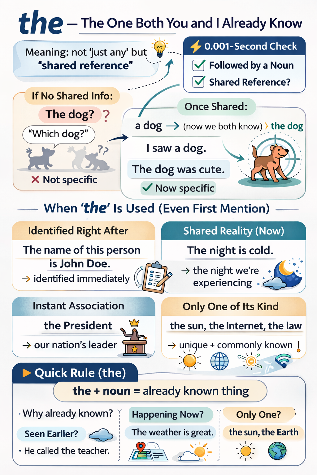 a cup은 여러 컵 중 하나를 가리키고, cups는 컵들을 막연하게 가리킵니다. 반면 the cup은 이미 특정된 대상을 가리킵니다. 다시 말해, the는 화자만이 아니라 독자도 그 대상을 식별할 수 있다고 전제할 때 쓰는 신호입니다. 그래서 the를 볼 때마다 가장 먼저 떠올려야 하는 것은 두 가지입니다.