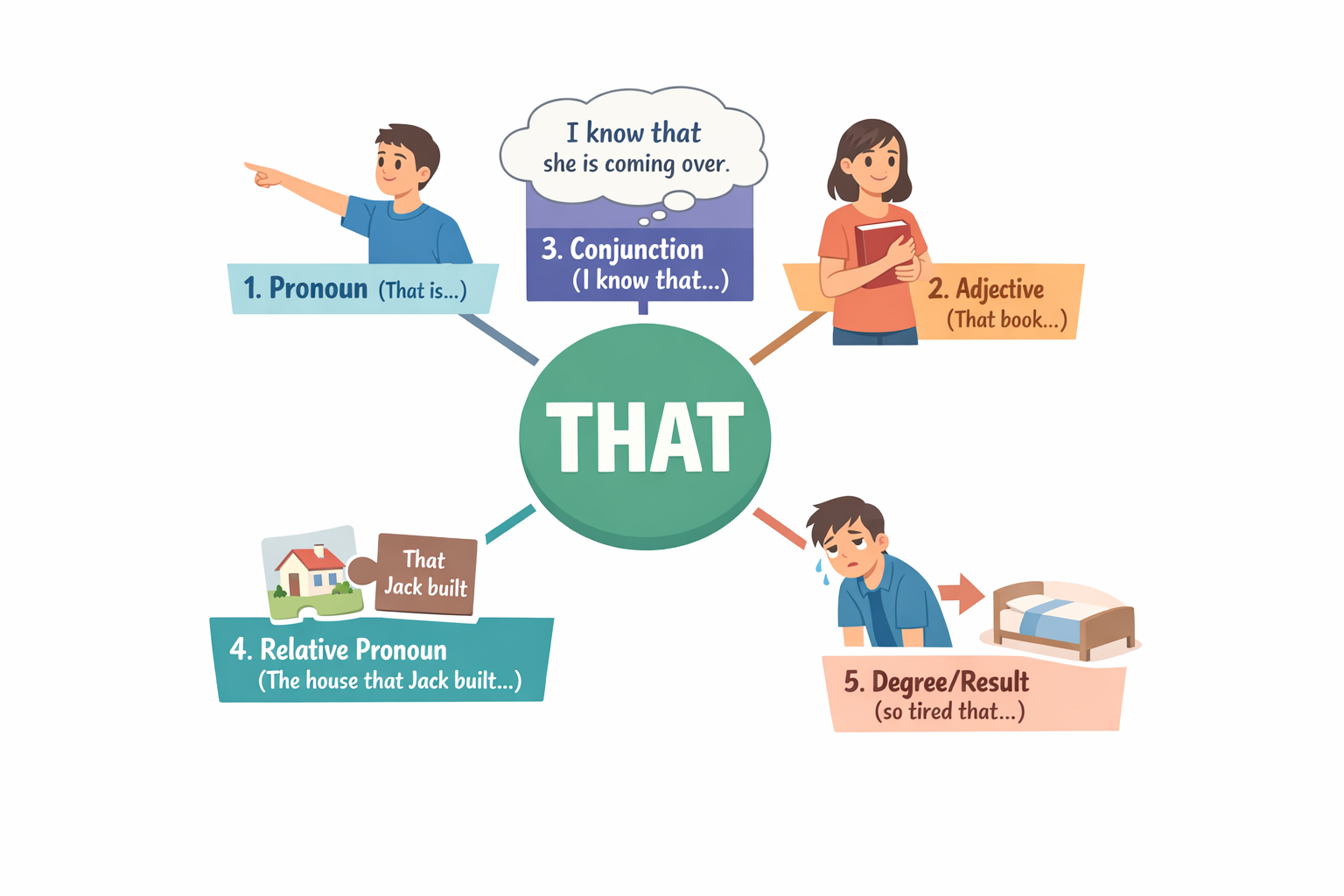 이 장에서는 that이라는 하나의 단어가 문장 안에서 어떤 역할로 변신하는지를 딱 다섯 가지로 나누어 정리합니다. 겉모습은 하나지만, 문장에서의 기능은 다섯 가지. 이 구분이 보이기 시작하면, that은 더 이상 헷갈리는 단어가 아니라 문장 구조를 알려주는 표지판이 됩니다.
