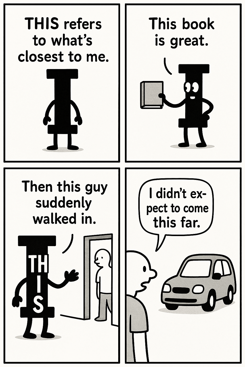 this는 ‘지금 이 순간, 내 앞에 놓여 있는 것’을 가리킵니다. 눈에 보이거나 손에 닿는 물리적 거리뿐만 아니라, 막 말했거나 지금 막 떠올린 생각까지 나와 가장 가까운 대상으로 묶어 주는 표현입니다. this는 거리의 문제이기도 하고, 시간, 생각, 이야기 흐름의 문제이기도 합니다.