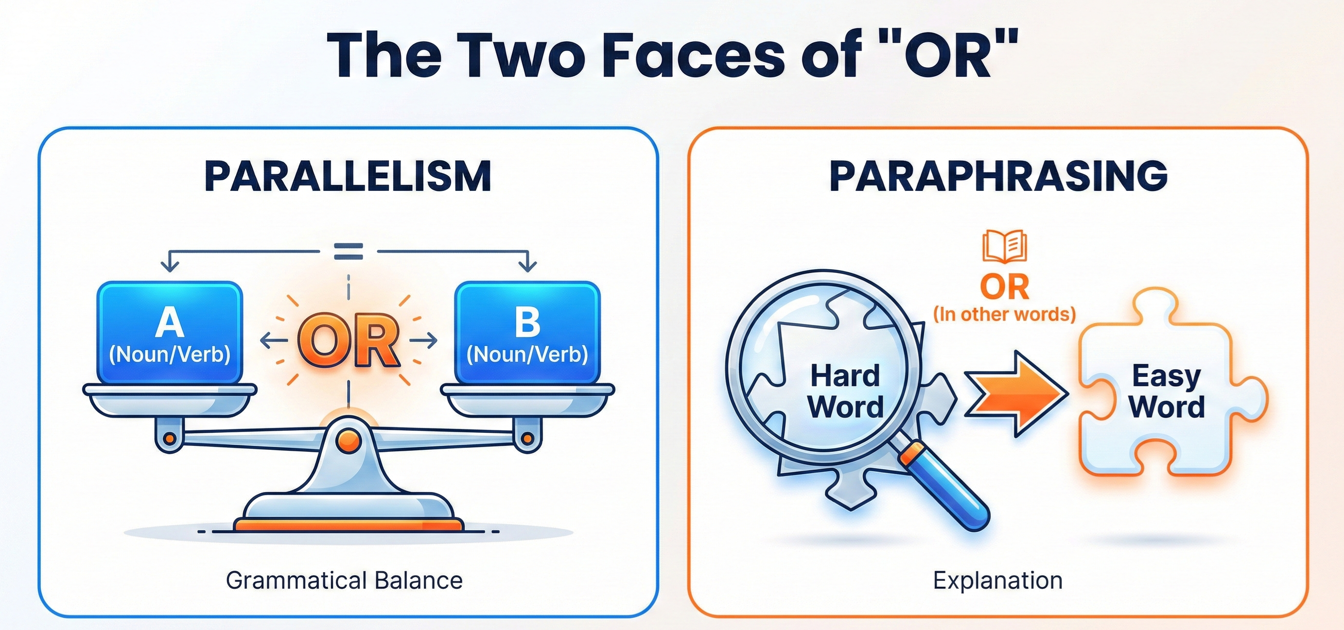 이때의 or는 선택이 아니라 A ≈ B (같은 맥락의 동의어/확장)를 나타내는 강력한 힌트입니다. 이 환언의 or는 보통 콤마(,)와 함께 A, or B, 형태로 끼어드는 경우가 많습니다.
