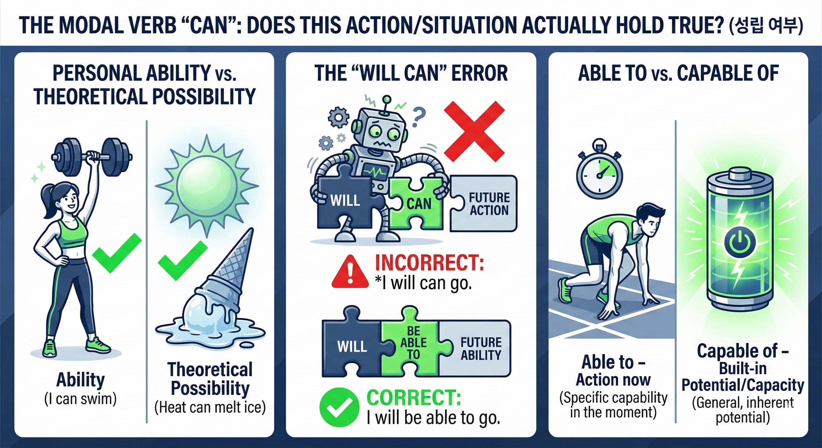 can을 무작정 '할 수 있다(능력)'라고만 외우면 수능 독해에서 한계에 부딪힙니다. can의 핵심은 "이 행동이나 상황이 실제로 가능한가"를 따지는 것입니다. 즉, 개인의 능력을 넘어 상황, 규칙, 논리적 가능성까지 판단하는 넓은 의미의 단어입니다.