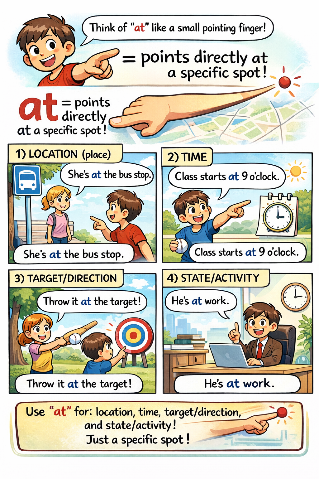 at은 손가락으로 ‘정확한 지점’을 콕 집어 가리키는 역할을 합니다.
