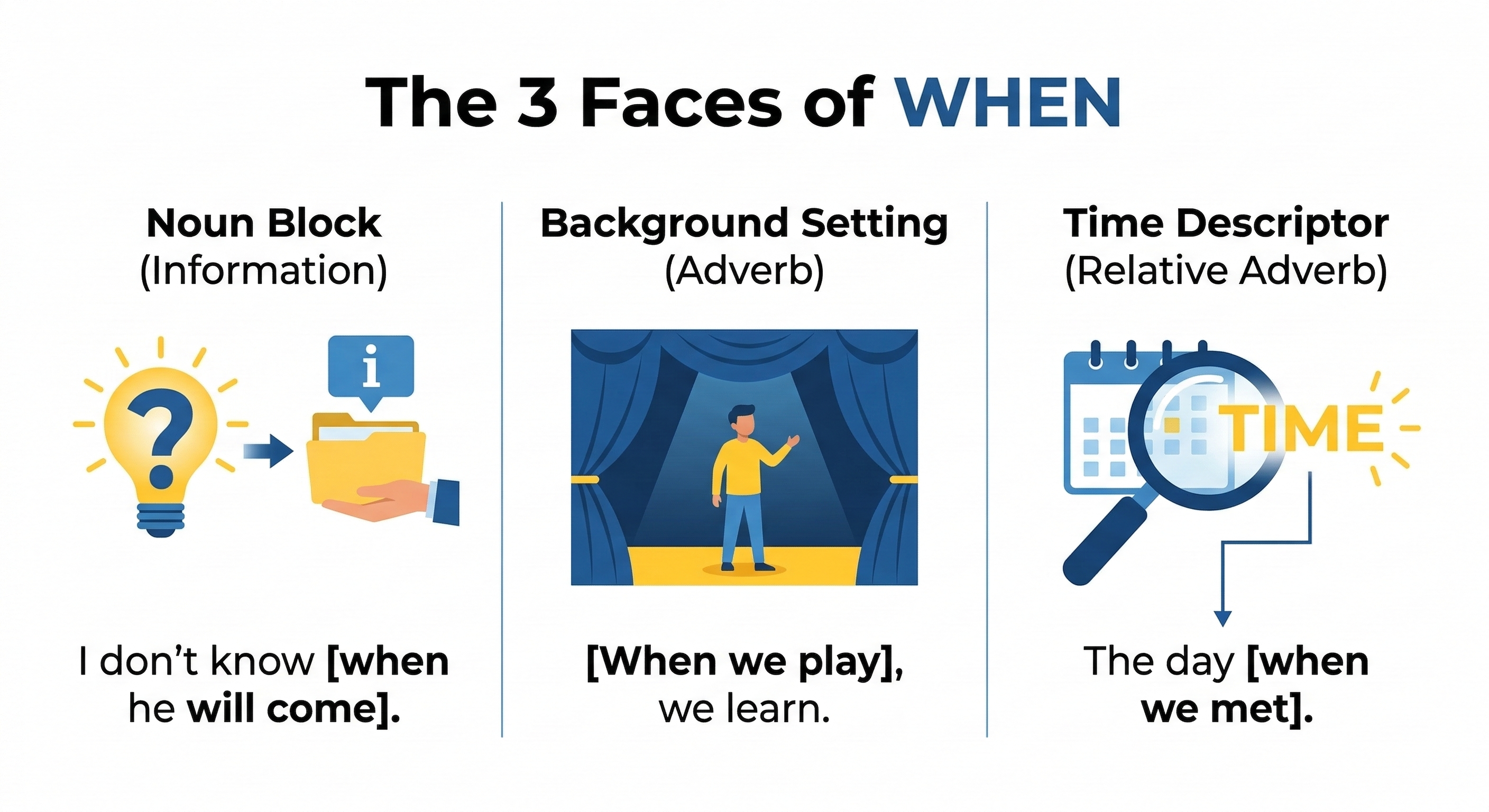 when이 보이면 무작정 '언제'라고 번역하지 말고, "이게 지금 '언제'라는 정보(명사)인가, '상황 배경(부사)'인가, 아니면 '앞의 시간을 설명(형용사)'하는가?"를 구조로 즉시 판별한다.