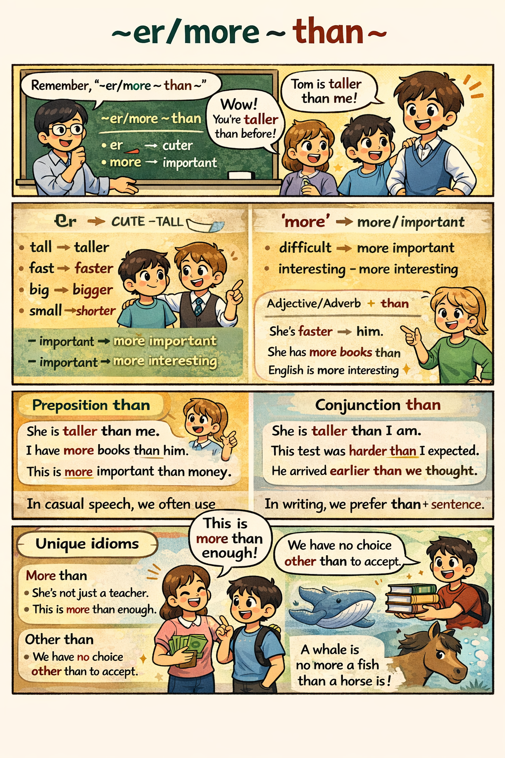 more 바로 뒤에는 형용사·부사·명사가 올 수 있고, than 뒤에는 명사 또는 문장이 옵니다. 말하고자 하는 내용에 맞게 조합해서 사용하면 됩니다. 참고로, 일반적으로 음절이 적은 단어는 ~er, 음절이 많은 단어는 more를 사용합니다.