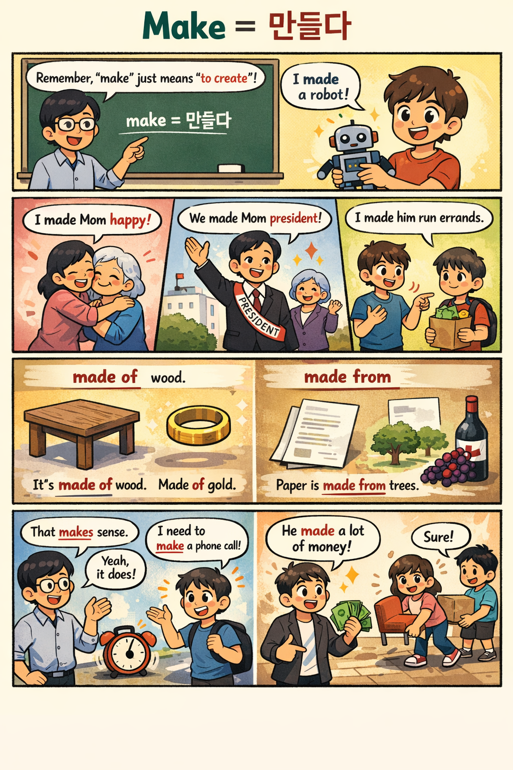 We made Mom President of Korea. (O) (엄마를 한국 대통령으로 만들었다.)