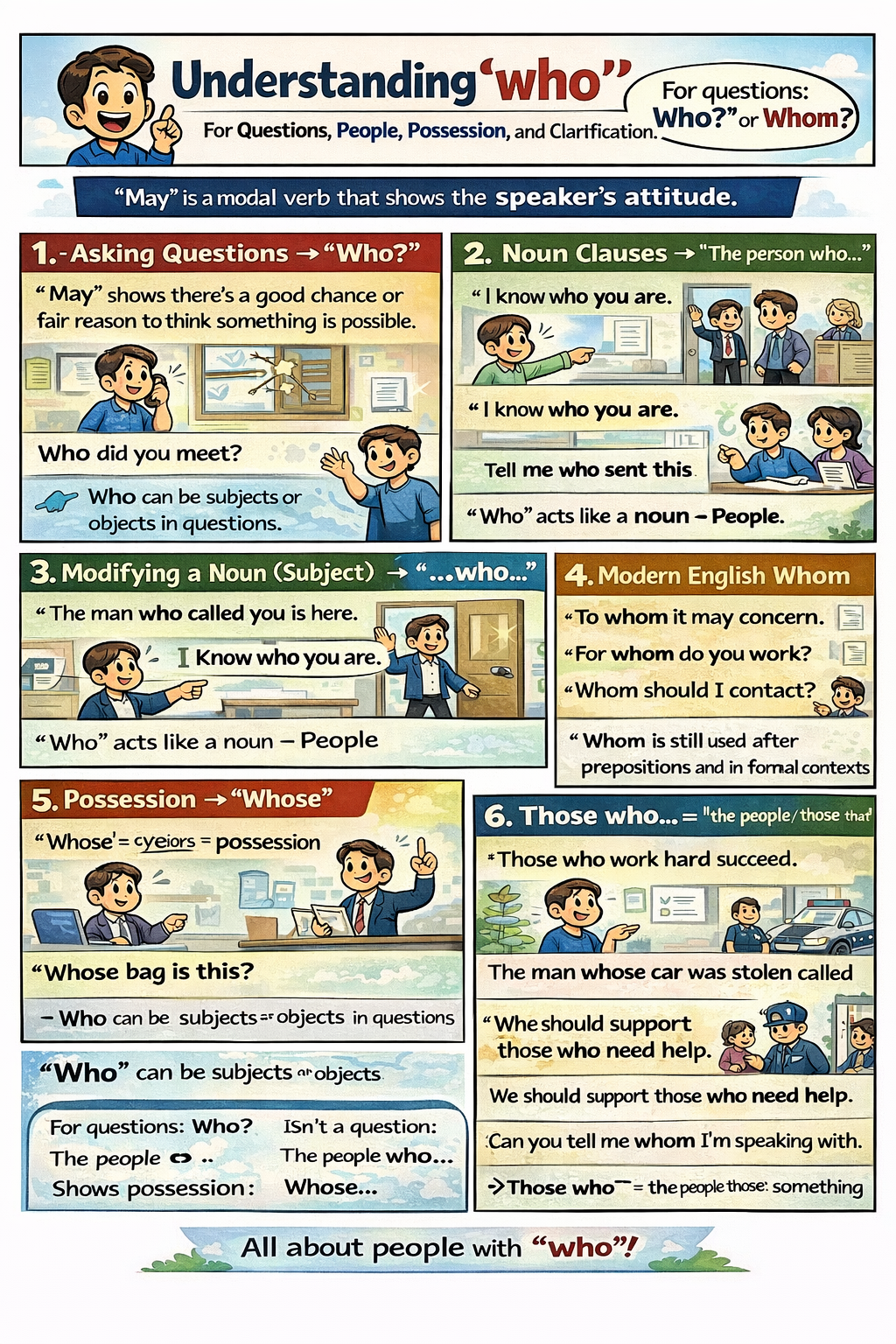 이 글에서는 who의 사용법을 세 가지 핵심 분류로 정리하고, 현대 영어에서 여전히 살아 있는 whom 표현, 그리고 whose의 의미와 사용법, 마지막으로 those who~ 구조를 함께 다룹니다.