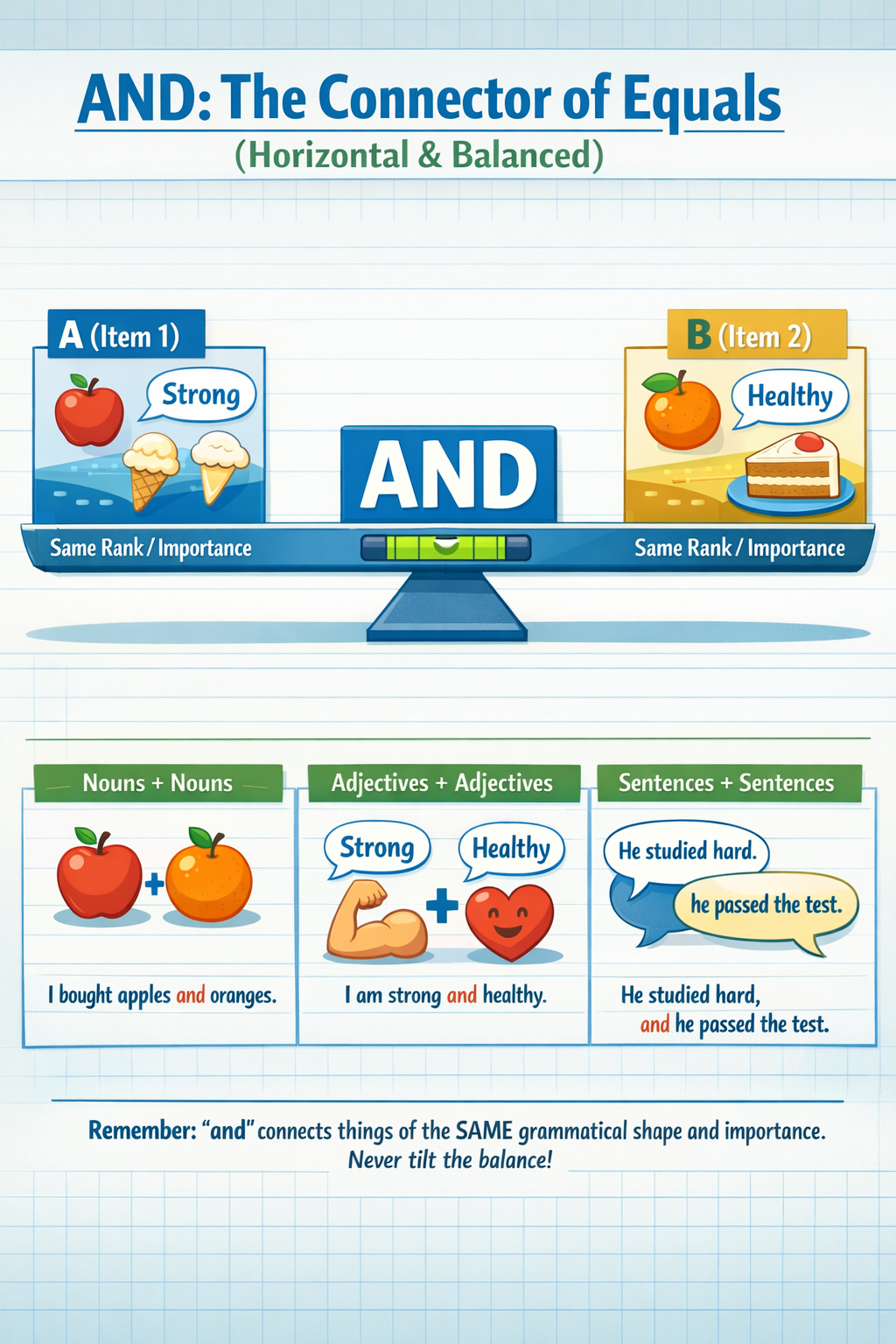 해설: 같은 품사인지, 같은 역할인지, 같은 중요도인지 확인하세요. 명사면 명사, 형용사면 형용사, 문장이면 문장으로 형태의 균형을 맞춥니다. 이 원리만 맞으면 and 해석은 끝납니다. and는 결코 위계(상하 관계)를 만들지 않고 수평으로만 묶어줍니다.