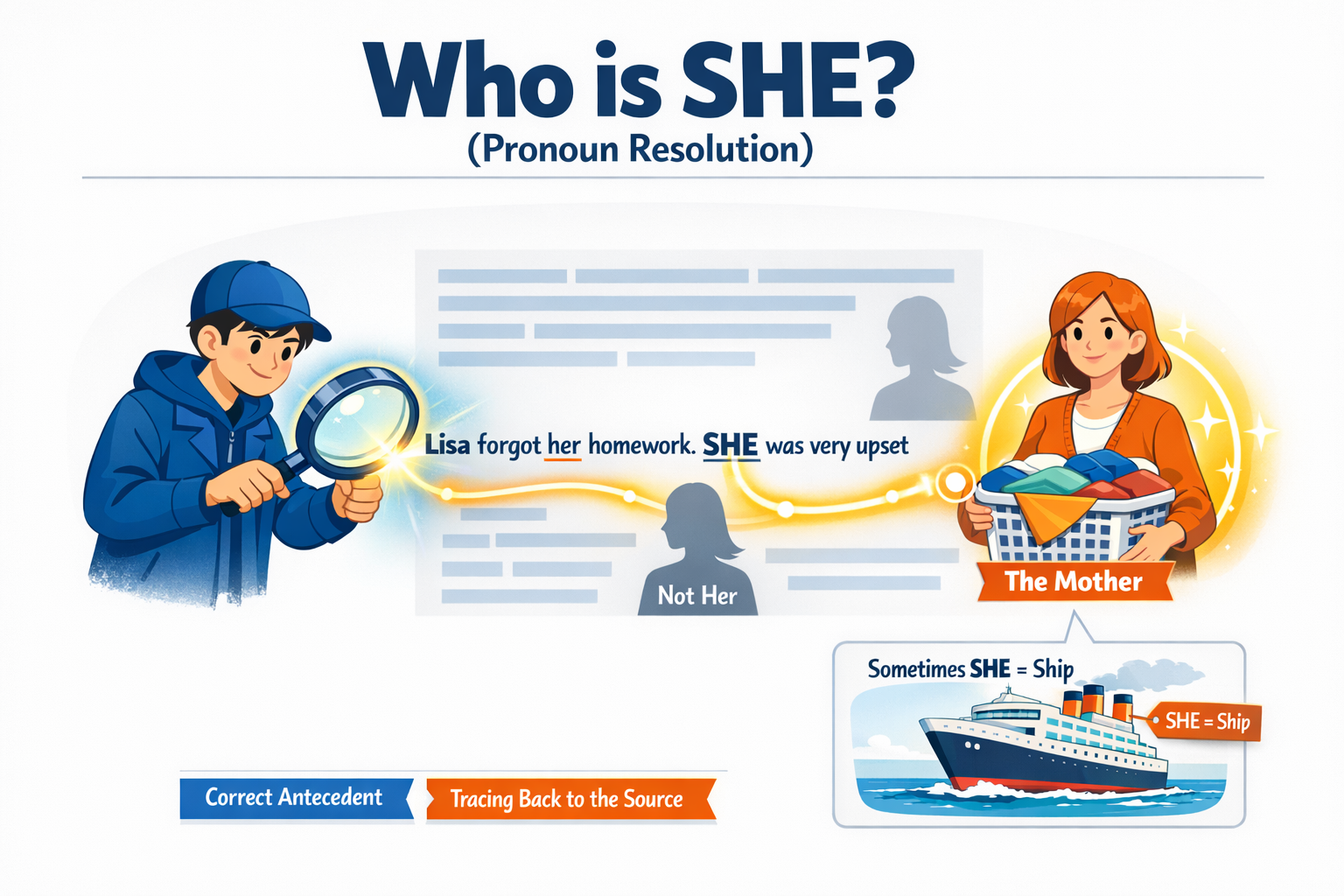 she를 보면 → '그녀'라고 뭉뚱그리지 말고, "이 행동(동사)을 한 사람이 앞의 두 여자 중 누구인지"를 찾아 원래 이름표로 바꿔 읽는다.